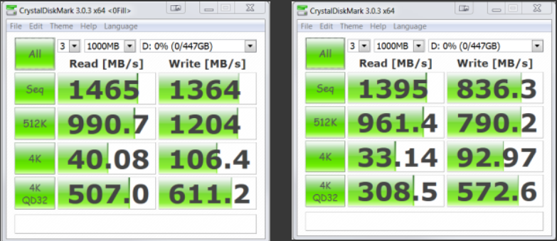 Crystal Disk Benchmark is used to measure read and write performance through sampling of highly compressible data (oFill/1Fill), or random data which is, for the most part, incompressible. Traditionally, LSI SandForce controlled SSDs did better with highly compressible data than that of incompressible data. Let’s take a look at the results, compressible on the left and incompressible on the right.