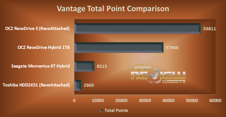 This bottom chart is particularly interesting because, all but the Seagate Momentus, are part of the same storage device which is the OCZ RevoDrive Hybrid SSD. If you remember, we physically disassembled the Hybrid in order to test the Revo 3 and Toshiba hard drive separately. This also reminds us of how significant a jump moving to a solid state drive is from a hard drive.