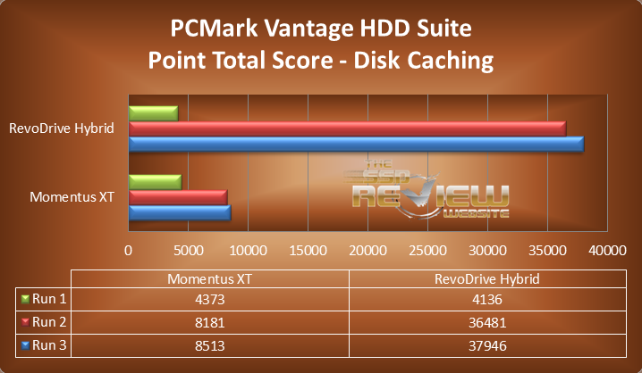 PCMark Vantage is the one place where we saw the RevoDrive Hybrid caching truly shine and this could be verified with the first run of the hybrid where the results were similar to that of an upper tier hard drive. Lets take a look at the comparison chart between the Hybrid and XT to see how the caching improves the performance of both. Both represent the PCMark Vantage HDD Suite ‘Total Points’ Scores.
