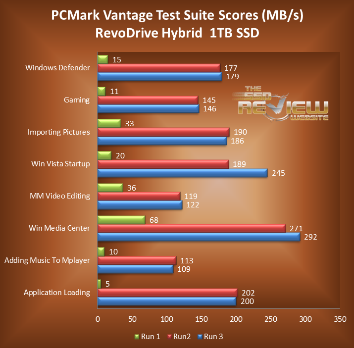 The SSD Review uses benchmark software called PCMark Vantage x64 HDD Suite to create testing scenarios that might be used in the typical user experience. There are eight tests in all and the tests performed record the speed of data movement in MB/s to which they are then given a numerical score after all of the tests are complete. The simulations are as follows: