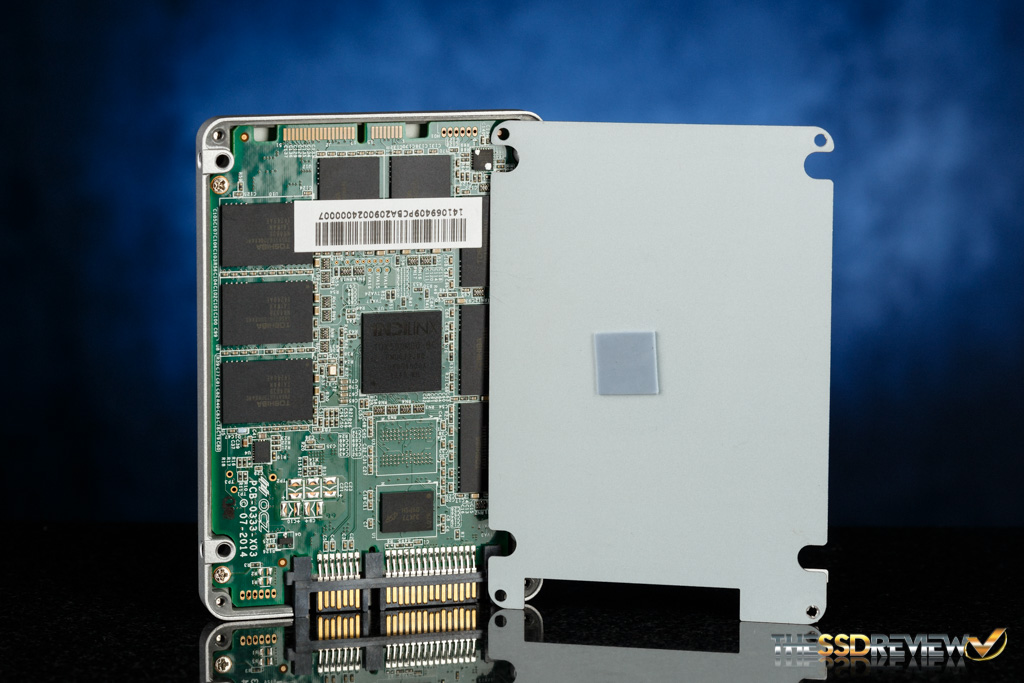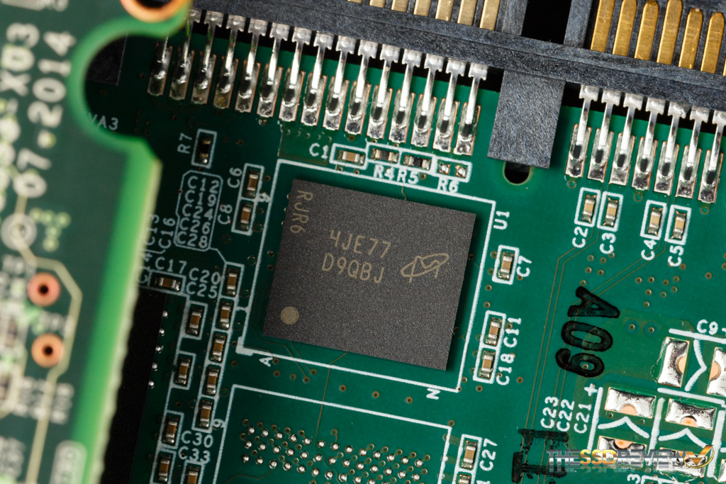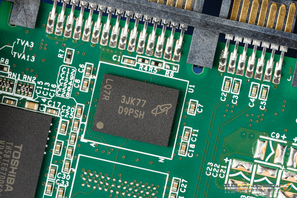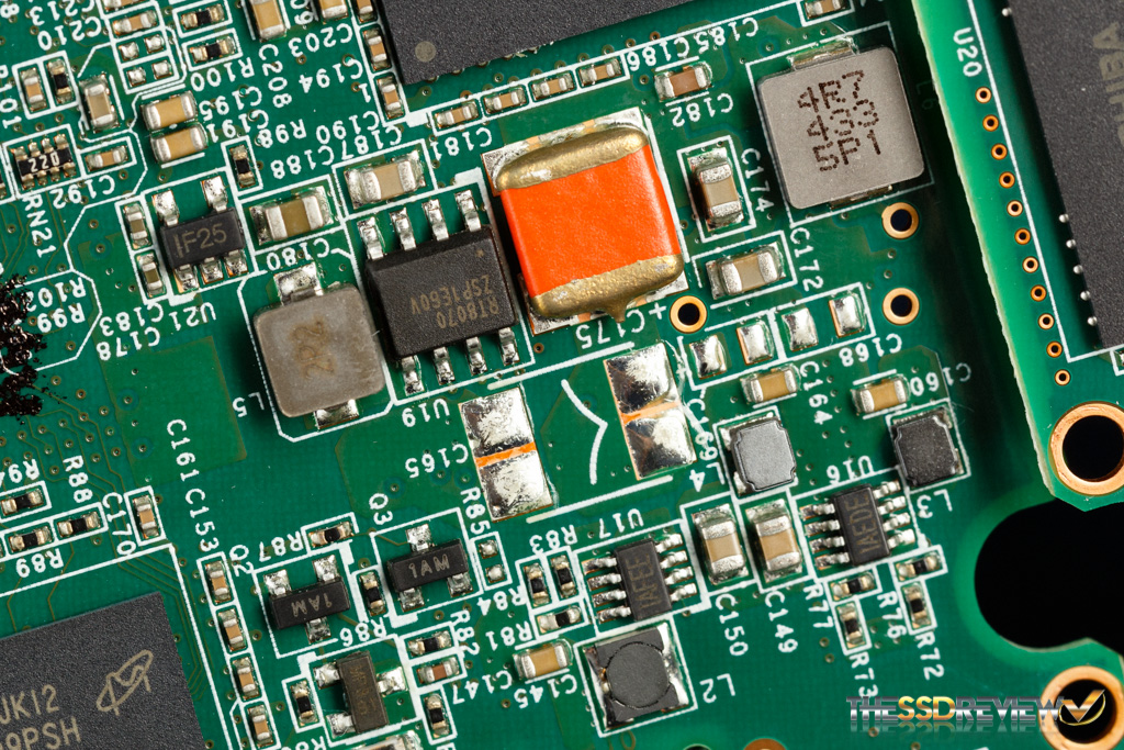 Below we have a close up of the capacitor used in the Power Failure Management Plus (PFM+) feature, which helps prevent ‘bricked drive syndrome’ that can occur during sudden power losses.