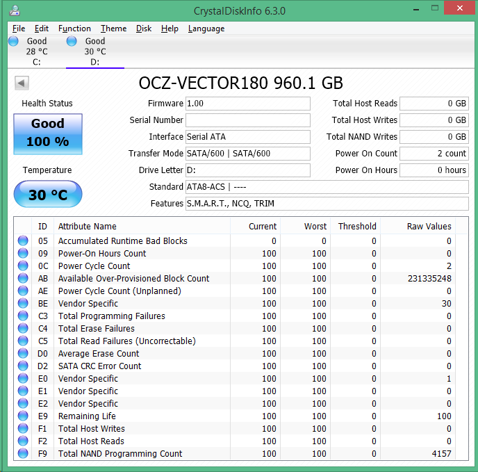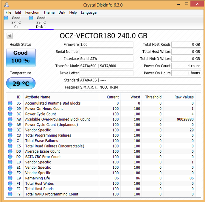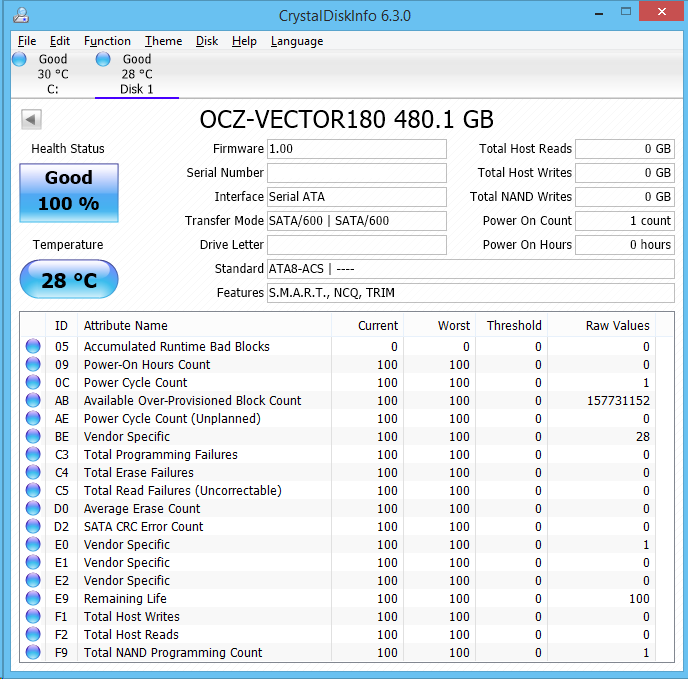 Crystal Disk Info shows us a multitude of S.M.A.R.T. data for these drives including a working read and write counter as well as a total NAND writes counter to show actual writes with write amplification factored in. There is also a working temperature sensor built into the controller. The firmware revision we are testing with today is 1.00. As this is more of desktop enthusiast oriented SSD and the controller was developed quite a while ago, there is no support for DevSleep. However, you can see that TRIM and NCQ are still functioning.