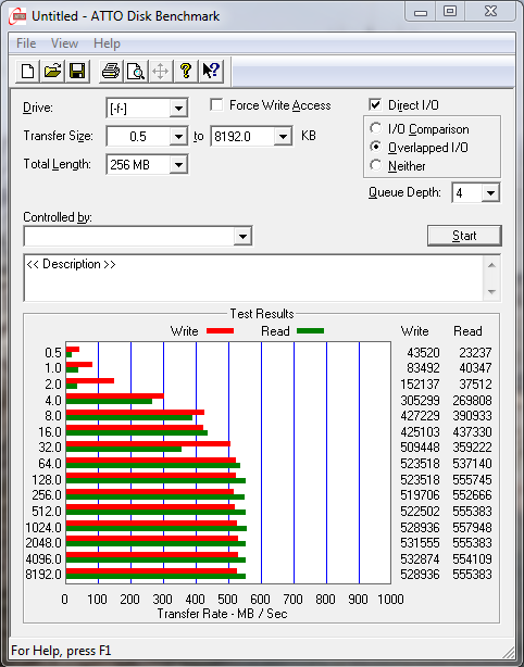 Specifications list 550MB/s read and 530MB/s write performance and ATTO results are just about exact at 555MB/s read and 528MB/s write. Having these same numbers result in the transfer of highly incompressible data will be very convincing as to the Vector’s performance.