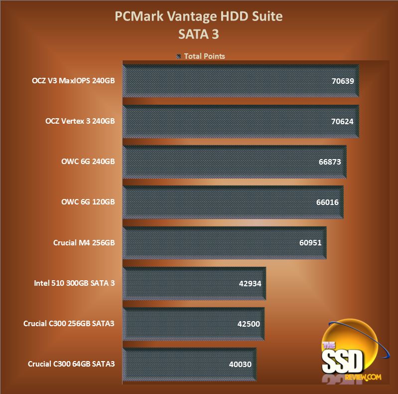 Although we have yet to reach SATA 3 bandwidth max, there will be a number of manufacturers introducing SATA 3 drives in the next few months. Next to actual ‘true to life’ testing which can take an insurmountable length of time, PCMark Vantage is the only program that can compare any SSD, side by side, regardless of SATA interface or controller in use.