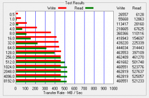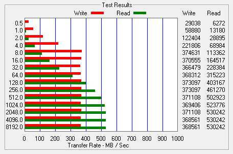 Specifications list 535MB/s read and 475MB/s write for the 512GB version and 535MB/s read and 380MB/s write for the 256GB version which is in line with what we are seeing here. This was a bit unexpected simply because ATTO favors the use of highly compressible data in its testing and we expected a performance drop. Adjusting the Queue Depth in ATTO testing shows no change in performance.