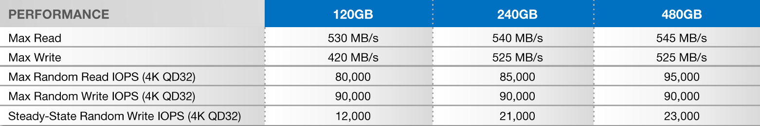 in capacities of 120, 240 and 480GB and MSRP pricing is listed as $99.99, $189.99 and 359.99, bringing it to a low price of about .74/GB. It’s best performance can be seen in the 480GB capacity with 545MB/s read and 525MB/s write and up to 95K IOPS, however, performance decreases slightly as the capacity decreases as displayed in these specs: