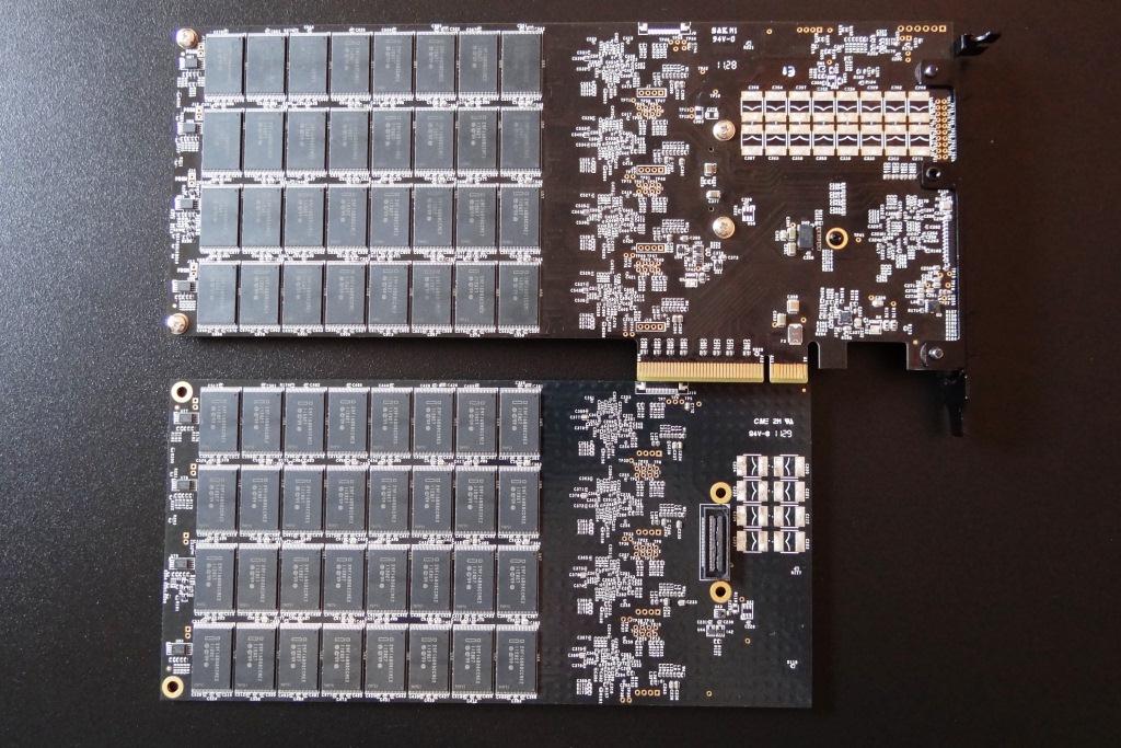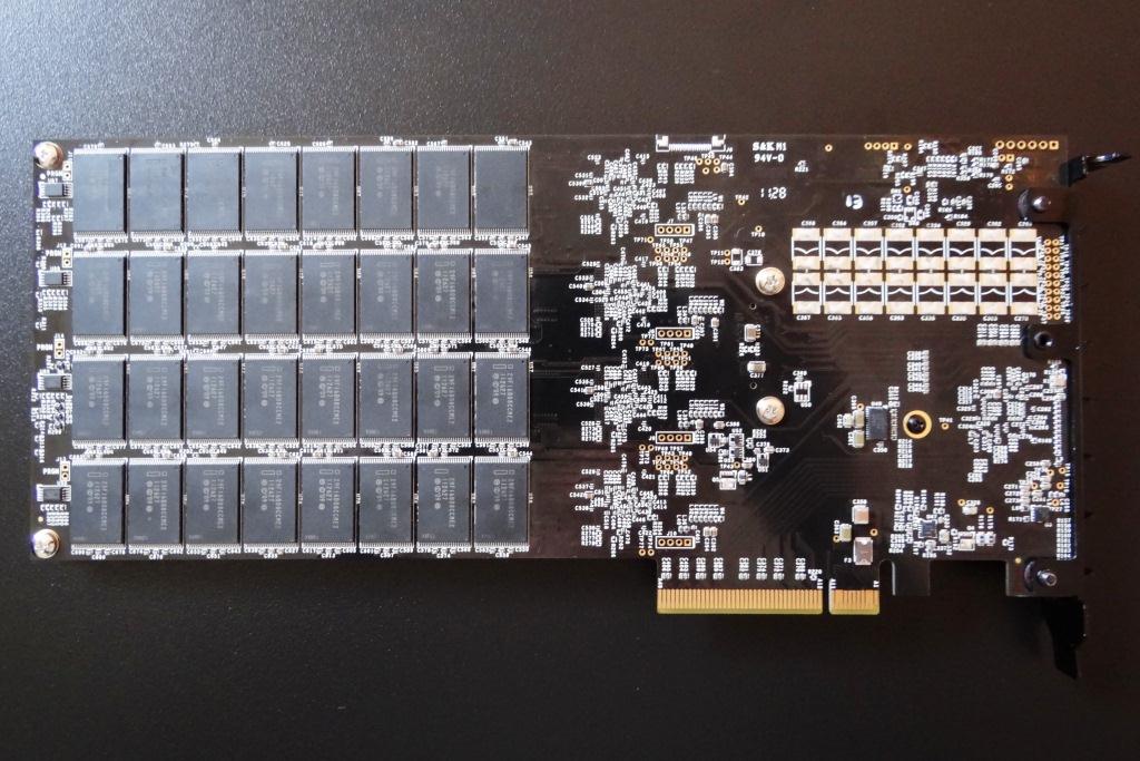 The Z-R4 is built on a mother and daughter printed circuit board (PCB) with a PCI Express Gen2 x8 interface. The PCB contains eight SandForce SF-2281 6Gbps processors (four on each board) and, in the case of our 1.6TB SSD, thirty-two modules of NAND flash memory on each side of each board. This totals 128 modules of Intel 25nm synchronous NAND flash memory (29F16B08CCME2) for a RAW capacity of 2048GB, however, standard enterprise over provisioning is set at 28% and their are other firmware needs.