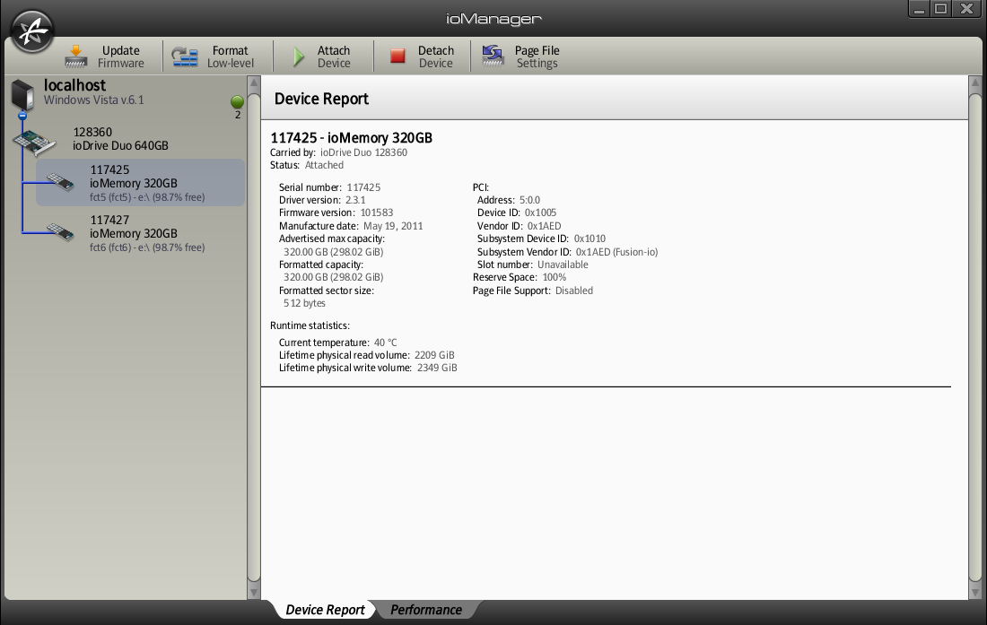 The software offers the opportunity to install several files and, in the end, we found ourselves contacting FUSION-IO support as we were not clear on the use of their GUI, ioManager. Support explained that we needed to format the drives from within the software and then ‘attach’ each within ioManager for them to become visible as drives in our system. Once visible, we can we RAID each (2×320) for full performance to be achieved.
