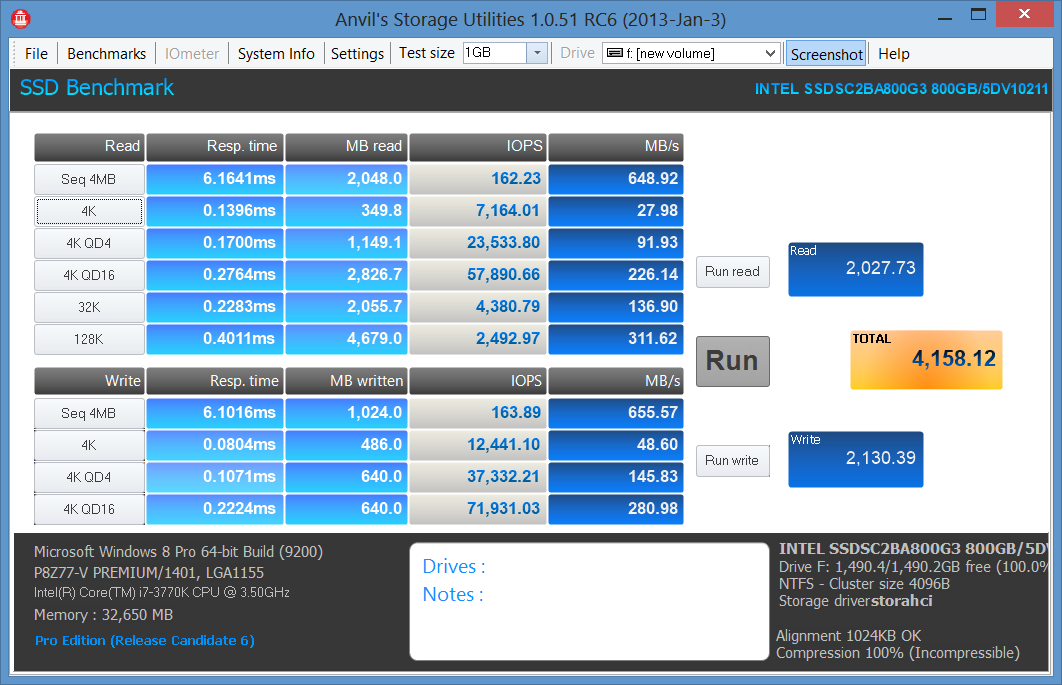 We elected to conduct Anvil Storage testing with 100% incompressible data just to give all a good look at the Accelsior at its best. Full identification of the system and drives in use is available on the bottom left and right of the result.