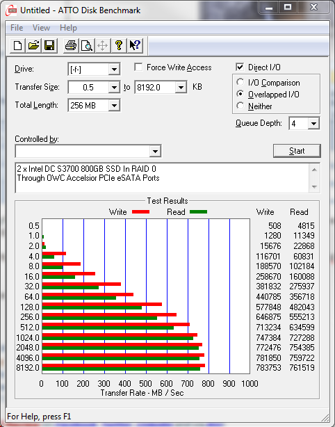 RAID 0 performance of 783MB/s read and 761MB/s write is an excellent start and was unexpected through eSATA to say the least.
