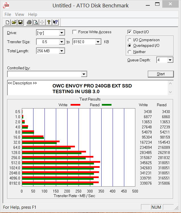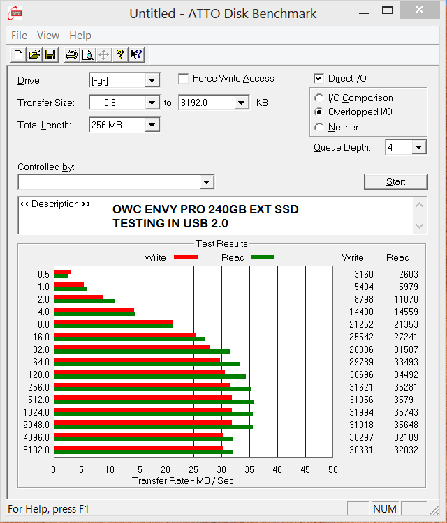 We have displayed the ATTO result in USB 3.0 on the right with that of USB 2.0 on the left. Clicking on any of our charts or photos will bring up a high resolution image.