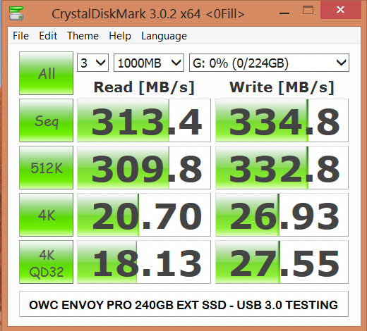 Specifications for the Envoy Pro EX describe typical LSI SandForce speeds up to 500MB/s which we have yet to see in a USB3 device, mainly because the USB bridge always seems to have a bottle neck. Although our transfer speed highs 0f 315MB/s read and 345MB/s write are the highest we have seen yet from a single USB3.0 enclosure, these are still lower than literature describing LSI SandForce speeds above 500MB/s read and write.