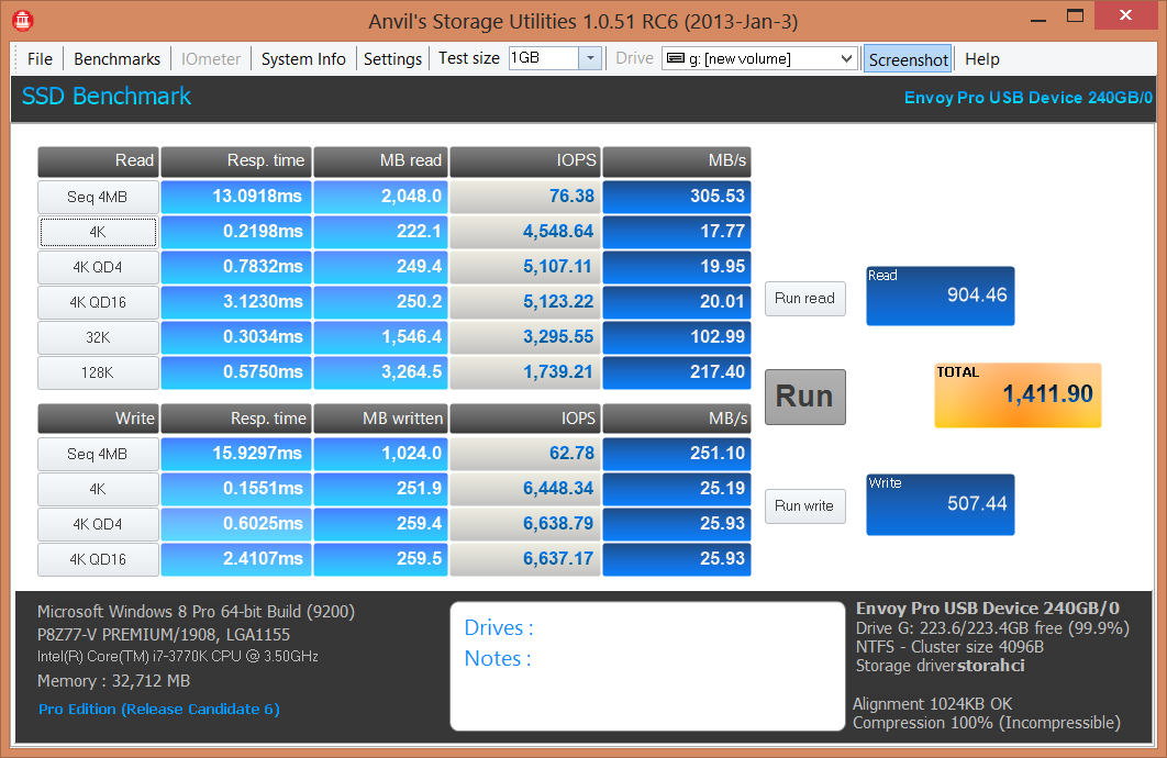 The OWC Envoy Pro is one of the strongest USB 3.0 performers we have had to date and it only seems fair to understand the performance while testing with incompressible data as well. We have excluded USB 2.0 testing as it’s performance won’t differ from what we have seen already.