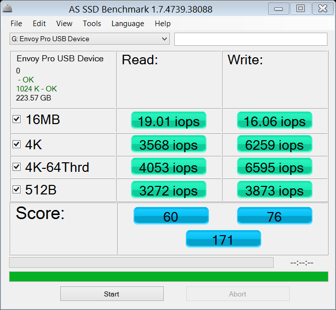 Performance seen through our AS SSD testing is exceptional for a USB 3 SSD and the incompressible sequential write results don’t deviate much from what we might typically see in a standard SSD. The AS SSD Copy Benchmark, however, is significantly lower than many of today’s SSDs: