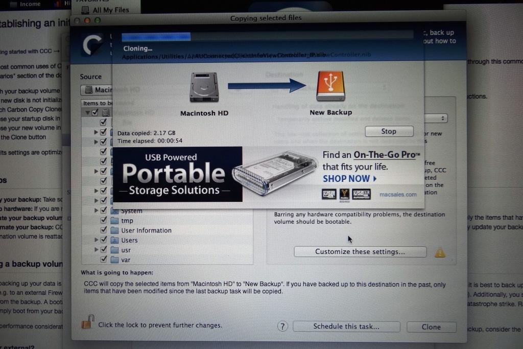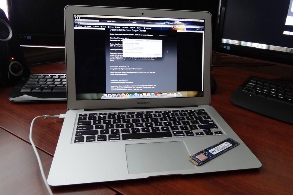 The first step is to download and install Carbon Copy Cloner and ensure that your external drive is connected to the MBA. From there, you need to prepare your external storage medium so that it is compatible with Mac OS X. You then start Carbon Copy Cloner, choose your source (system drive) and destination disks (external drive) and hit ‘Clone’. Once complete, your system will automatically boot from the external source so you can switch off the original SSD with the new OWC Mercury Aura Pro.