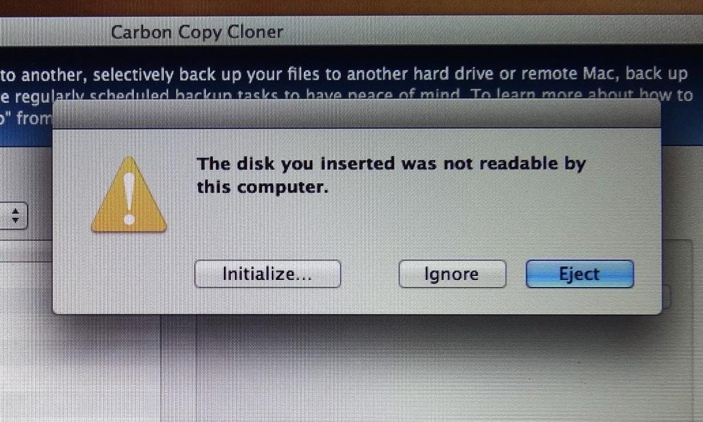 Once the drives have been replaced, secure the base with cover and pentalobe screws, turn the system over, plug in the external drive and reboot. It will restart from the external and the next thing that appears would scare the heck out of you if this were a Windows system. Simply initialize the new drive.
