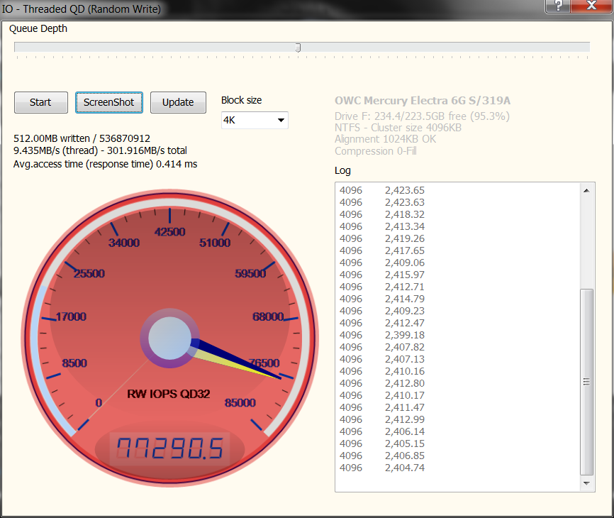 Specific things that we see included with this software is automatic identification of, not only your system specs but also, information relating to the SSD being tested. Unlike any others that we know of, the Anvil Pro provides the results of all disk transfer tests in both IOPS and MB/s, also indicating the response time and total MB read. Looking specifically at the 4K QD16, we were very impressed with the result of 77,855.60 IOPS which trumps just about every toher SSD tested to date. Lets manually switch setting to see what we can pull off: