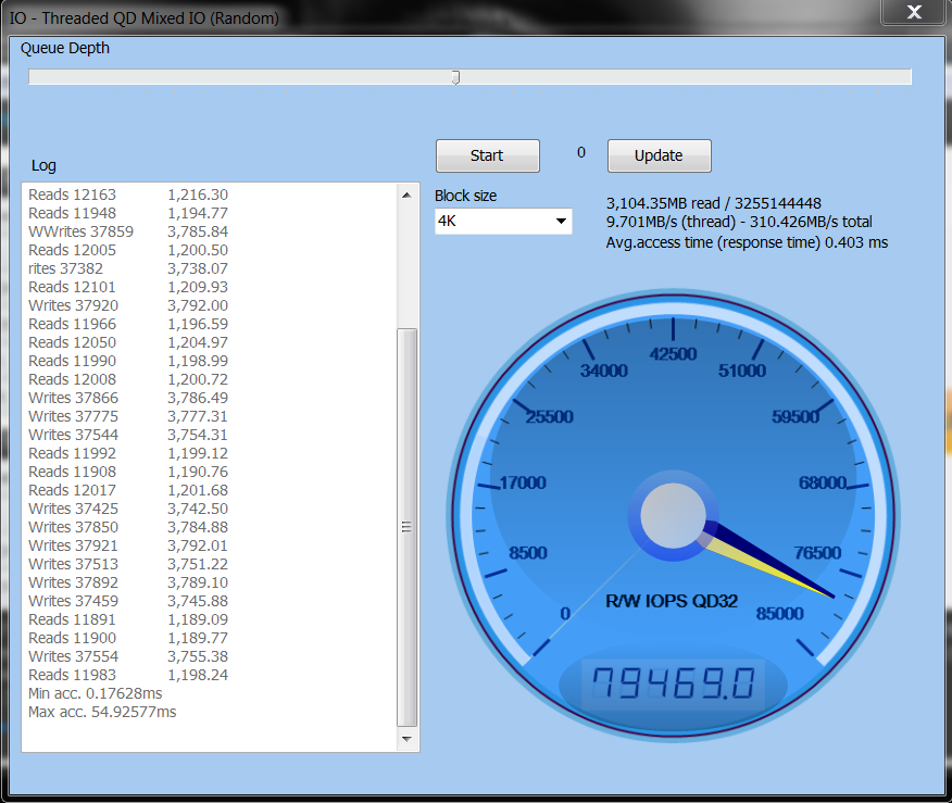 In the last test, we decided to remain at 4k with a random IO and it still climbed to 79469 which is an excellent representation of what the drive is capable of. I am going to take the opportunity here to link this thread at XtremeSystems.Org as Anvil, the author of this new benchmark software, has started SSD endurance testing unlike anything that we have seen in the SSD arena up to this point. It wasn’t even a year ago that people were questioning the lifespan of solid state drives and comparing them to listed specifications with predictions of foul.