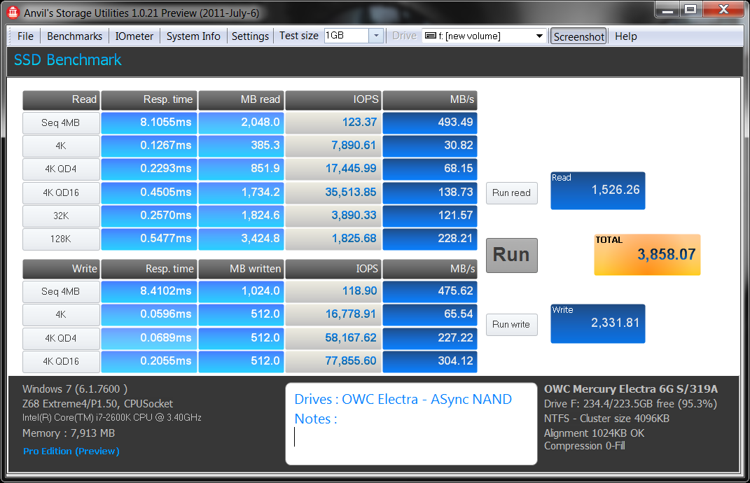 Over the last few SSD reviews, we have been introducing our readers to a new benchmark program called Anvil Storage Utilities which is an absolutely amazing program when it comes to benchmarking solid state drives. Not only does it have a preset SSD benchmark, but also, it has included such things as endurance testing and threaded I/O read, write and mixed tests, all of which are very simple to understand and utilize in our benchmark testing. Lets take a look at the Anvil Pro SSD Test result for the OWC Electra:
