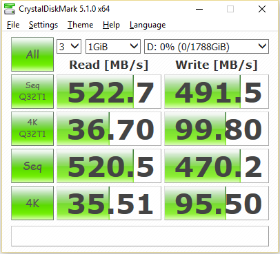 In AS SSD this SSD reaches an overall score of just 422 points! This is obviously due to very poor high queue depth performance. Sequential speeds reach 490MB/s read and 440MB/s write. 4K read comes in at 32MB/s while write is a bit slower at 83MB/s. Looking at the IOPS results, it is sad to see that this drive is not able to achieve anywhere near its rated spec of 60K IOPS. Let’s move on to Anvil and see if it does any better there.