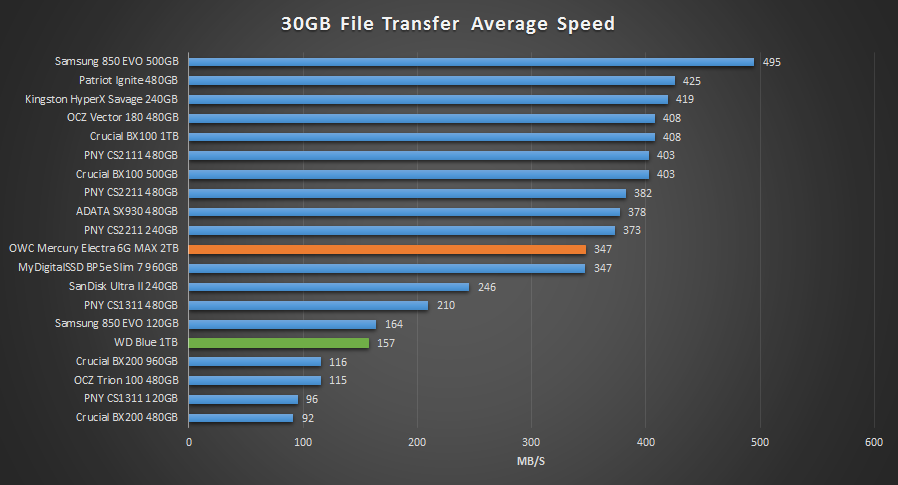 Finally, we wanted to see how performance was in a real world use when transferring large files to the SSDs. For this test we are going to simply stress write performance by transferring over a 30GB folder of movies off of one SSD to this one and time how long it takes. Once complete we can calculate the average speed.