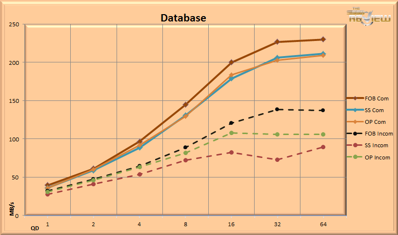 The Database/OLTP (On-Line Transaction Processing) profile is another heavy-usage type of access that can bring many drives, even those with superior write performance, to their knees given Steady State conditions. With small 8K random data being read at 66% and written simultaneously at 33%, the OWC SSD performs very well. Databases tend to be extremely compressible, so in real deployments look for the performance to be along the upper lines.