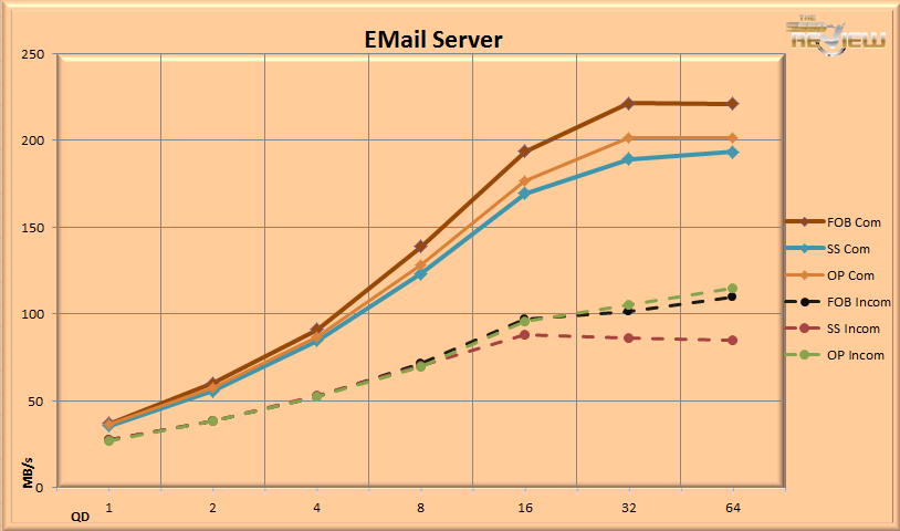 The Email profile is an emulation of a mail server, with a 50% Read and 50% Write mixed workload with very small 8KB files. This can be a very stressful test for even the best of drives. Here the OWC SSD does very well, peaking at 193 MB/s at a Queue Depth of 64.