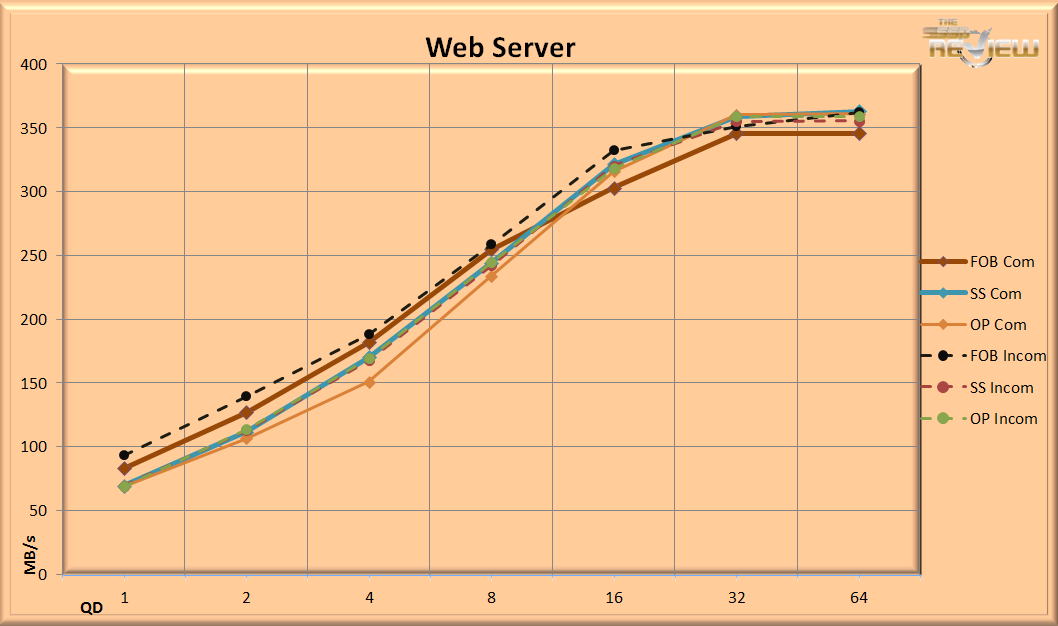 The Web Server profile is read only over a wide range of file sizes, with pure random data. As we can see there is very little variability for any drive state, or when using compressible and incompressible data. As a whole, the compressibility of data does not affect the read speed, so this performance is very good.