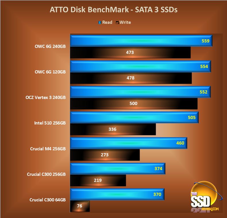 The following chart displays all results we have obtained through ATTO in the SATA 3 category: