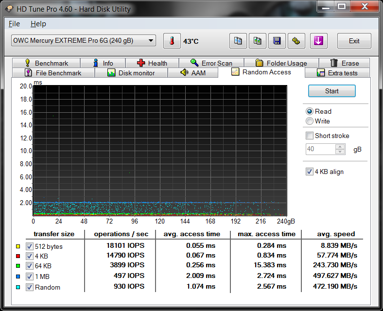 Something particularly interesting about this test is the smoothness of the line which is a great indicator that this is a solid drive. As well, the access time of .055ms is typical of new SSDs and considerably faster than the typical time of 9-10ms for a hard drive. The access time is the key factor in why we see such quicker operations from a solid state drive compared to the hard drive.