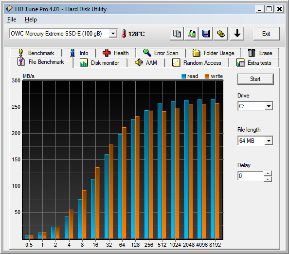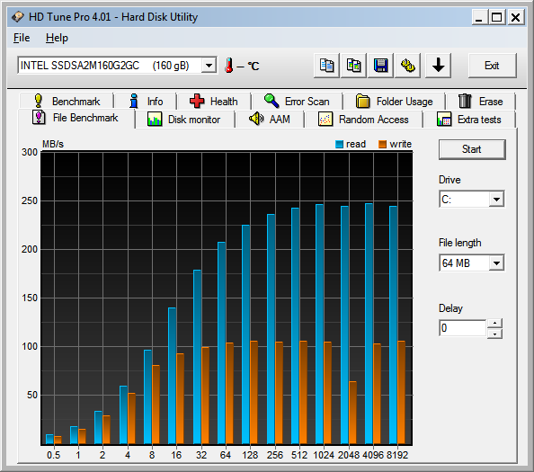 The HDTune File Benchmark is an excellent medium to portray how the Intel appears to be capped at about 100MB/s in its write speeds. This is still simply a belief as Intel hasn’t commented either way with respect to it.