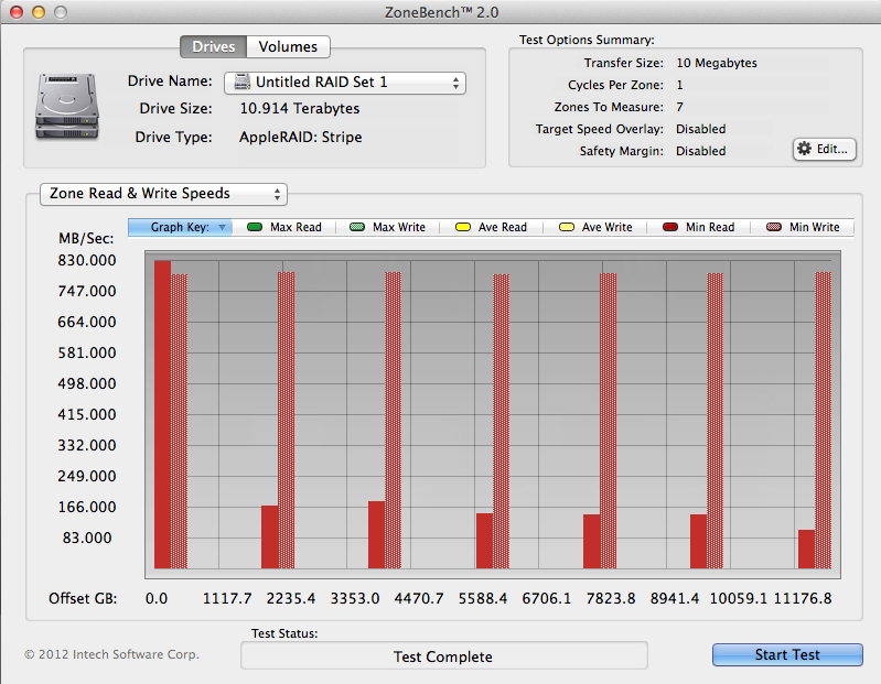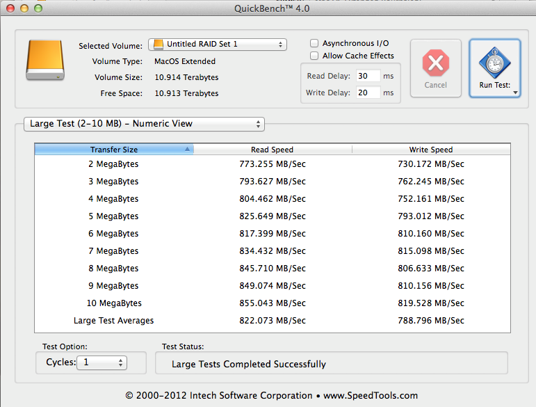 With performance highs of 849MB/s read and 819MB/s write transfer speeds, we get a very clear picture of just how well OSX works its RAID environments. This performance is much better than one would ever expect, considering the performance of below 200MB/s we saw in ATTO and Crystal DiskMark single drive testing.