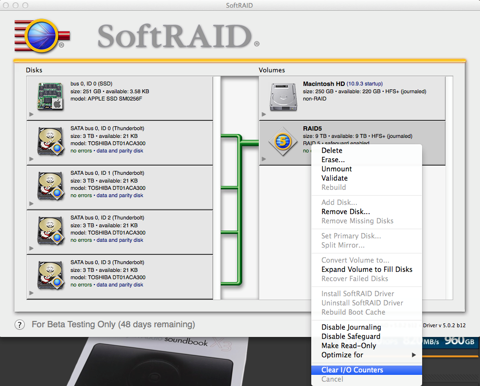 The main screen identifies the volumes that can be included in the RAID configuration and one can simply right-click for individual drive options, or drag and drop the drive to the right. We grabbed this shot of the menu screen to show how detailed this software really is.