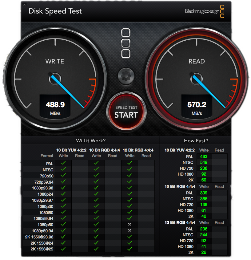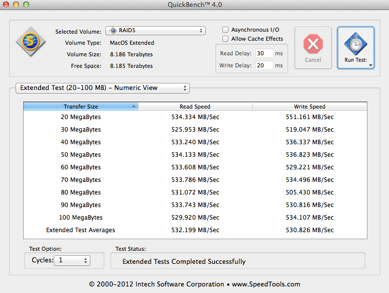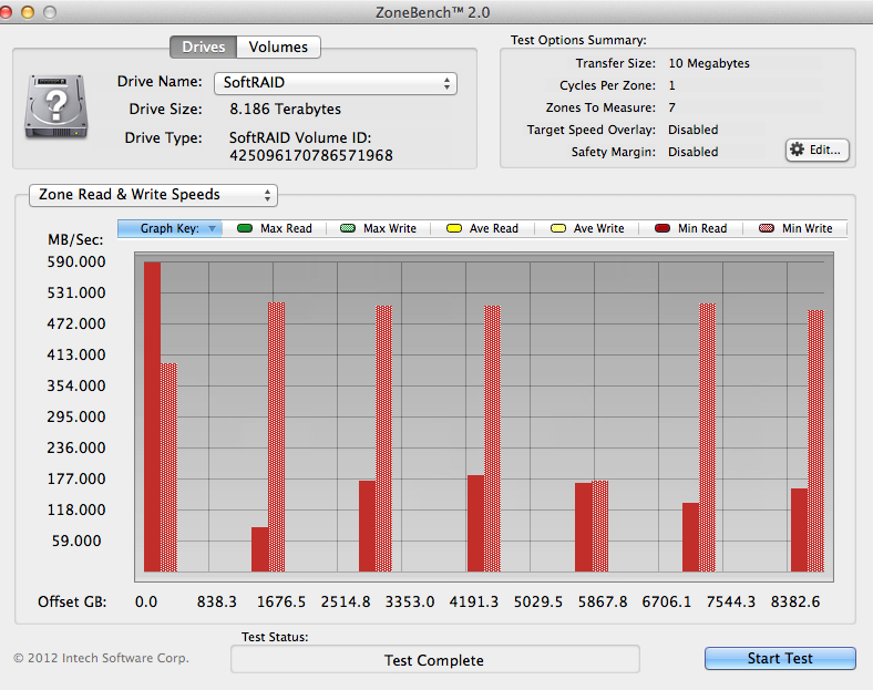 In our last battery of tests, we have set up SoftRAID‘ RAID 5, an exclusive software application that can be purchased with the Thunderbay 4. Reiterating what we stated earlier, RAID 5 is a striped volume and provides increased speeds commensurate with that. In our 4 drive configuration, the volume of three drives will typically be used while redundancy confirms data security of the volume. Remember… should one drive go bad, it can be hot swapped without loss of any data whatsoever. As well, this software is only available for OSX.