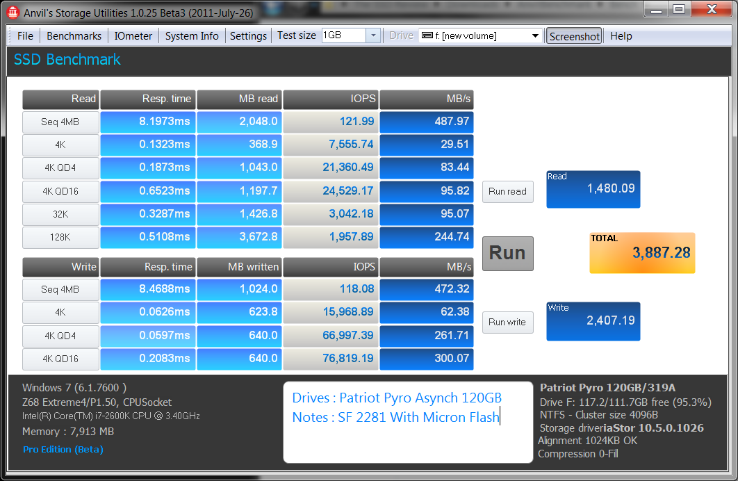 You may not see this for long (and its definitely not common) but you get a freebee simply for reading! Over the last little while, we have been assisting with beta besting new benchmark software called Anvil Storage Utilities which is an absolutely amazing SSD benchmarking utility. Not only does it have a preset SSD benchmark, but also, it has included such things as endurance testing and threaded I/O read, write and mixed tests, all of which are very simple to understand and utilize in our benchmark testing. Recently, we published the exclusive public release here and, if you happen to check it out, there is a FREE download of the software! Lets see how the Patriot Pyro fares on the Avil Pro: