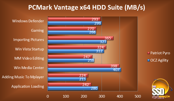 The Patriot Pyro Total Vantage HDD score was 62318 with a high transfer speed of 390MB/s in working with Windows Media Center. The score is an excellent result and places it just above the Corsair Force 3 which returned a 62227 points. Lets display our transfer speeds of the 8 tests in a side by siade comparison with the OCZ Agility, another Async SSD.