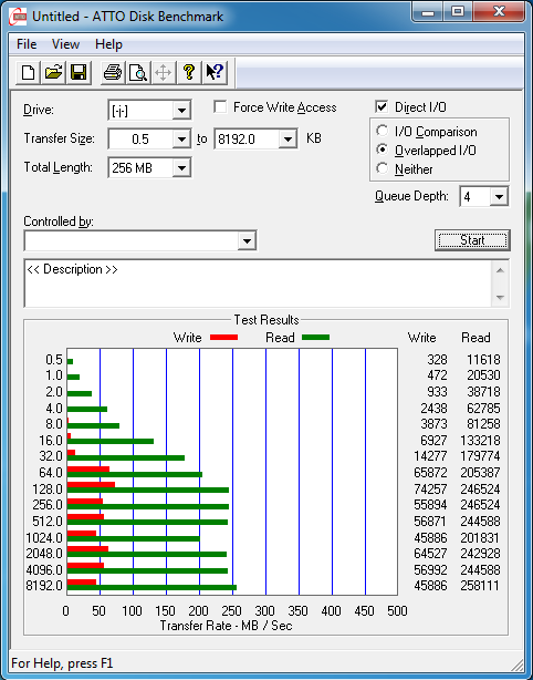 In ATTO we see some mixed results. The drive is achieving a max read of 258MB/s read and 74MB/s write. Read wise this is pretty much near the 260MB/s rated speed, but write is under half of what it should be. Usually we see the fastest speeds out of ATTO due to its testing with fully compressible data. Hopefully our other benchmarks will let us see higher write.