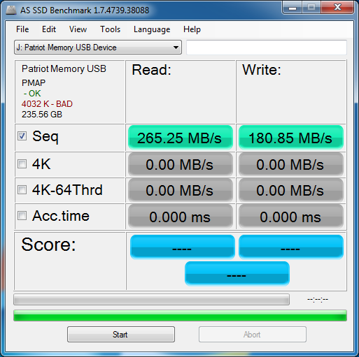 There we go! AS SSD is able to show us better than rated speeds. This is great. We have 265MB/s read and 180MB/s write! Much better than the rating of 260MB/s read and 170MB/s write. We weren’t able to run the entire AS SSD bench on this drive due to its very slow 4k speeds. This drive is made for more larger media files than small OS files, thus there isn’t much need for the manufacturer to focus on them.