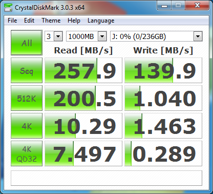 Finally we have Anvil’s Storage Utilities to test with. Max sequential read speed is 259MB/s and max write is 151MB/s.