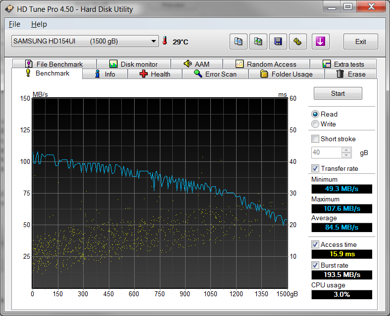 To do this, we would like to again draw your attention to the HD Tune Pro BenchMark of the Patriot earlier (left) and compare it to that of our relatively new Samsung SpinPoint F2 1.5TB hard drive (right).