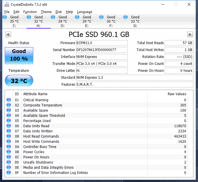 Crystal Disk Info is a great tool for displaying the characteristics and health of storage devices. It displays everything from temperatures, the number of hours the device has been powered, and even to the extent of informing you of the firmware of the device.