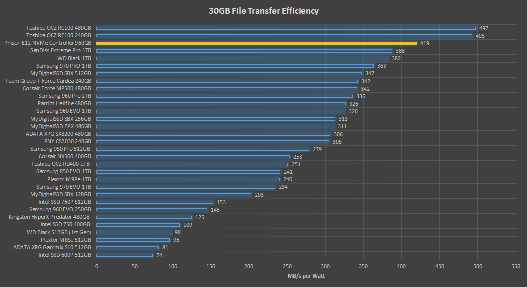 The chart above shows us just how efficient an SSD is in writing data. Here we can see that the Phison E12 with BiCS3 NAND is very efficient and beats the WD Black/SanDisk Extreme Pro, Samsung 970 Pro, and even the MyDigitalSSD SBX which has their PCIe 3.0 x2 E8 controller in it.