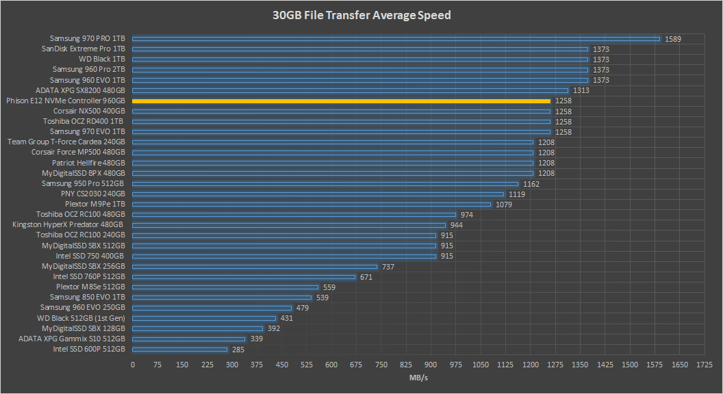We also wanted to see how performance was in a real-world use when transferring large files to the SSD. For this test, we are going to simply stress write performance by transferring over a 30GB folder of movies off of a 250GB Samsung 960 EVO to the test SSDs and time how long it takes. Once complete we can calculate the average speed.