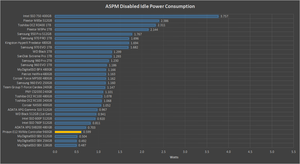 First up we have our results with Active State Power Management disabled. Here they averaged 0.6W at idle. This is a welcomed improvement from the E7 which averaged about 1-1.1W.