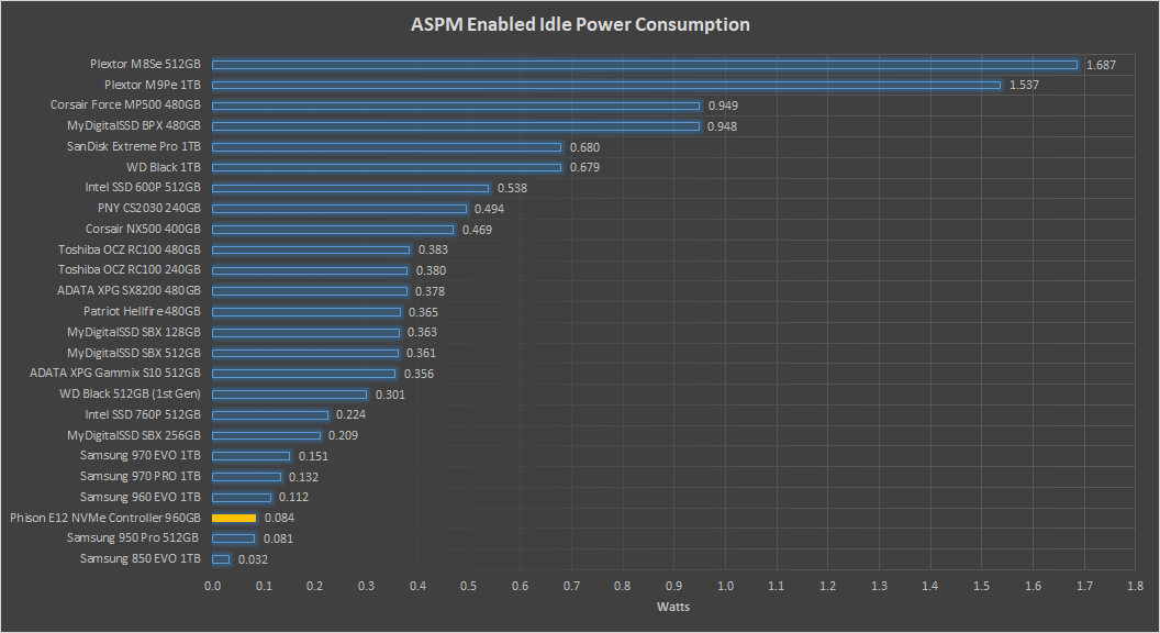 In the chart above we are showing the idle results with ASPM enabled and Windows power plan set to power saver, rather than high performance. We can see that it consumes even less power, just 84mW, which is a significant improvement from the E7 which consumed about 0.5W-1W in our test samples.