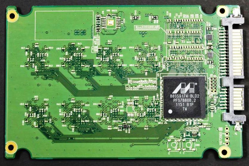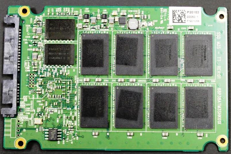 The top of the printed circuit board (PCB) contains eight pieces of Toshiba 24nm Toggle NAND packages, along with 512MB of DRAM cache memory for increased SSD endurance and performance, and the bottom of the PCB holds the Marvell 88SS9174-BKK2 processor. Each module is 32GB in size for a total capacity of 256GB, however, the total available storage after formatting is slightly less at 238GB.