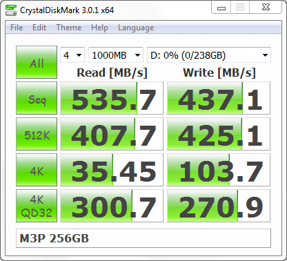 The sequential numbers seen in ATTO are replicated here in CrystalDiskMark. 535MB/s read and 437MB/s writes are intriguing results. There are some SATA III SSDs that don’t read as fast as the M3P writes. The 24nm Toggle NAND, combined with new firmware, has helped the random results, too. For 4K QD1 results, 35MB/s and 103MB/s are very competitive with the faster drives on the market. 4K QD32 results of 300MB/s reads and 270.9MB/s write are similarly impressive. Those QD32 throughput scores equate to 73,412 read IOPS and 66,137 write IOPS.