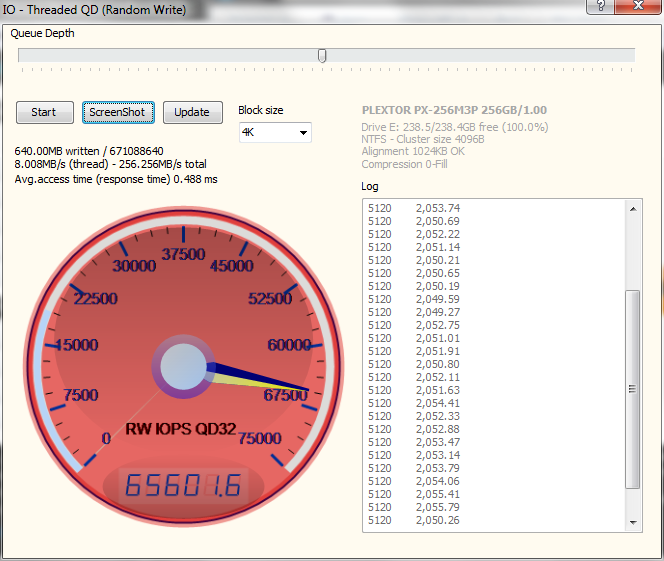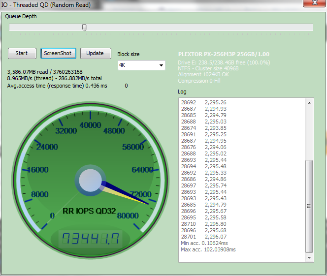 We tried pushing the M3P’s random performance with ASU’s threaded read and write performance tests. At a QD of 32, read IOPS hit 73,441. Write IOPS made it to 65,601. This is close enough to suggest that the Pro’s rated 75K and 68K are not excessively high.