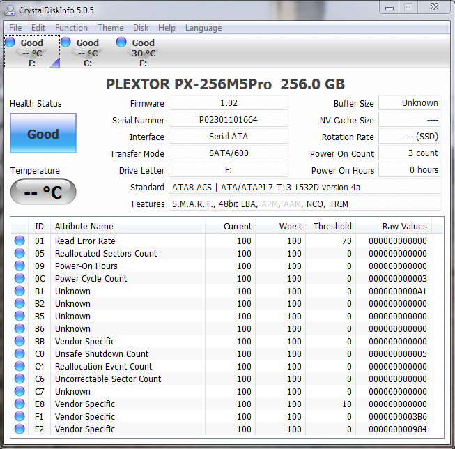 Crystal Disk Info provides some excellent information about the SSD itself to include its health, product information, power on information as well as the characteristics of the SSD. We can see that the Plextor M5 Pro Xtreme is capable of TRIM as it is not greyed out, much like AAM.