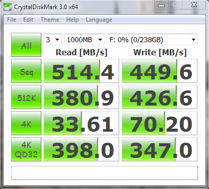 Crystal DiskMark is typical, although we would have like to see low 4k random write scores coming in a bit higher. Keeping in mind that this is not a new release, we are always hoping to see SSDs come in above the 100MB/s low 4k random write point which is still relatively uncommon.